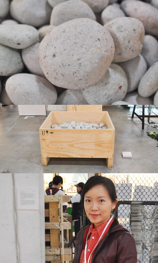 今年金賞由台灣人李姿玲獲得,第一眼看起來像是石頭的東西,其實是由非常非常多的統一發票製成,請大家捐出很多沒有中獎的發票,製成一顆一顆的石頭,握在手裡非常的震撼,意義上也不會讓人覺得艱澀難懂,很有意思!