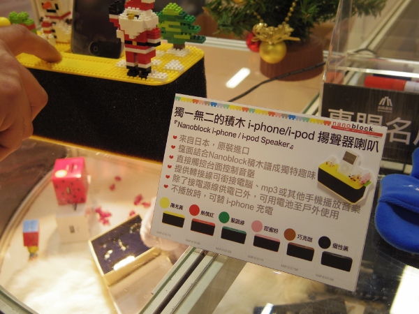 100年資訊展的靚品館區,一經過就看到一堆成列在迷你櫥窗中的超可愛積木小動物們,正在播放音樂的音響上面則很應景的擺了樂高拼成的小聖誕樹,一問之下原來又是nanoblocks的iPhone專用揚聲器,這款結合了迷你積木的音響,完全製作屬於自己獨一無二的小揚聲器,如果家裡本身就已經有蒐集相當程度的迷你積木玩具,還可以隨著心情或是五大節慶在上面做擺飾。