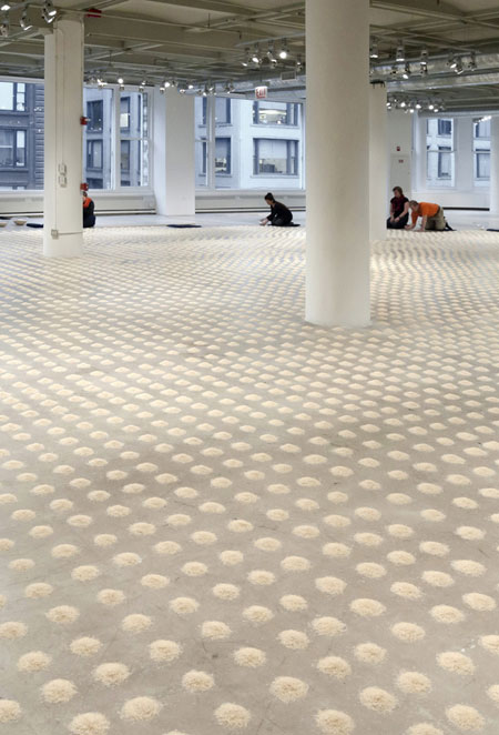 由於占地廣大,Wolfgang Laib找了數位芝加哥藝術學院的校友在十月時花費十天的時間一點一滴的拼湊,才同心協力將這項巨作完成。該作品幾乎佔用了芝加哥市區廣大的Sullivan North藝廊。作品會公開展示至今年12月23號,人在芝加哥且飯錢不夠的海外僑胞們,可以在展覽結束前過去裝點米回家煮(大誤)。