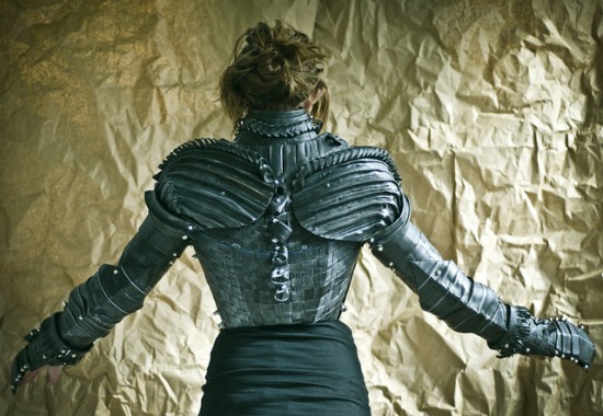 Grace選擇的角色是聖女貞德,她捨棄又重又貴的金屬盔甲,改用硬固紙和腳踏車輪胎內胎,完成了聖女貞德身上的盔甲,如何?即使不是真正的盔甲,但是每個細節都做得非常仔細,效果不輸給真正的盔甲吧!