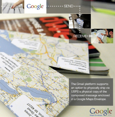 他們認為Gmail應該要增加寄信服務,支援一種實際遞送的選擇,透過USPS系統,將實體寫好的紙本信件放進印有送達目的地的地圖信封裡,將Sending envelope(送出信封) 的選項放在電子郵件的下方,並透過郵局服務傳送,只需要一點點費用,享有同時傳送電子與實體信件的樂趣。