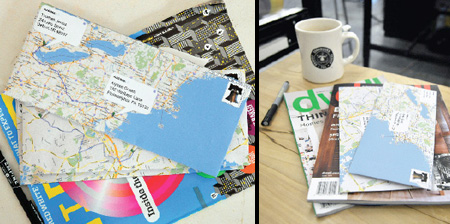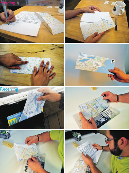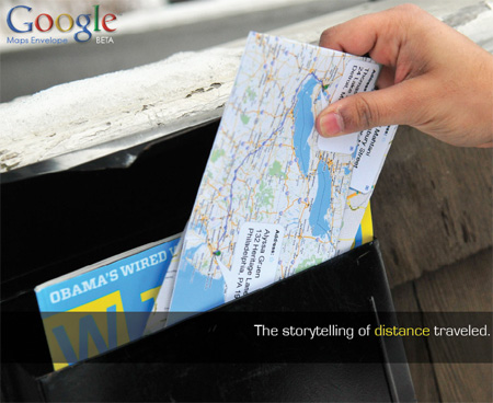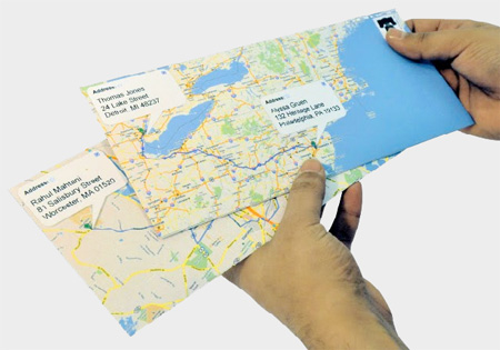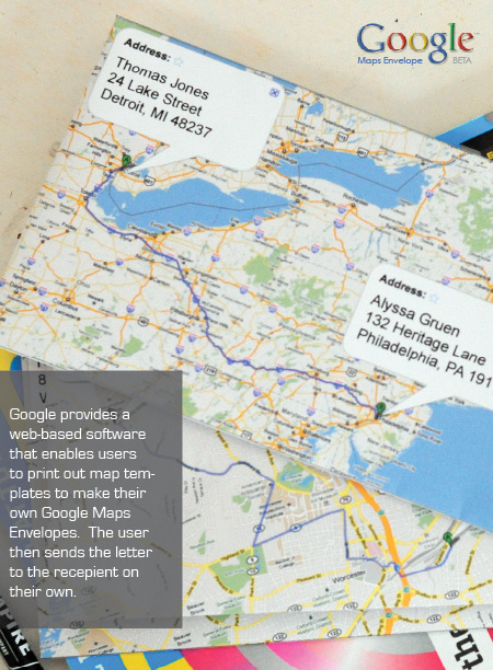 並且提供了web-based(開瀏覽器就可以用的)軟體,讓使用者可以印出地圖樣版,去製作他們自己的Google Maps信封。然後使用者就可以用這信封寄出信件給想要的收信者。在信封封面上印有送件人和收件人的地址以及路線規劃,收到信的人可以一眼就看出這封信旅行了多遠,也可以知道寄給你的人大約住在哪裡。