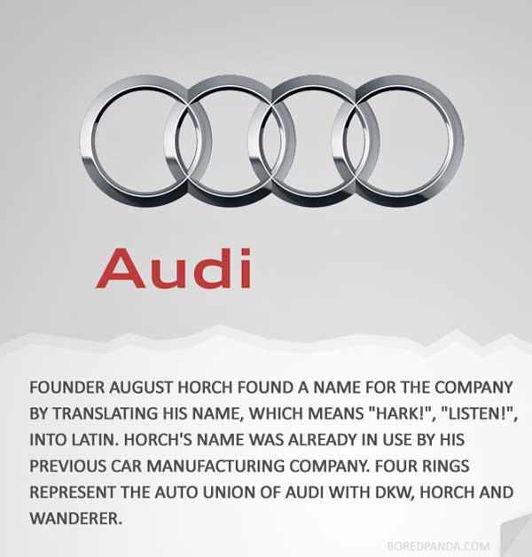 Audi創辦人August Horch的名字在拉丁文中,就是「Audi」,也就是聽覺的意思,之所以會堅持要翻成拉丁文,其實是因為「Horch」已經被他用在另一家汽車製造廠上頭,為了避免重複,所以才翻成拉丁文,而Audi商標上的那四個圓環,代表的就是Audi和其他三間汽車廠商DKW、Horch和Wanderer所組成的汽車聯盟。
