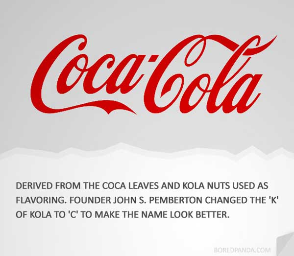 古柯葉(Coca leaves)和可樂果(Kola nuts)是可口可樂的兩個重要成分和原料來源,所以創辦人John S. Pemberton就將可口可樂取名為Coca Kola,之後為了對仗工整看起來整齊,把K改成C,也就是現在大家所看到的Coca Cola。