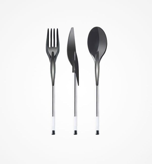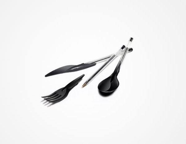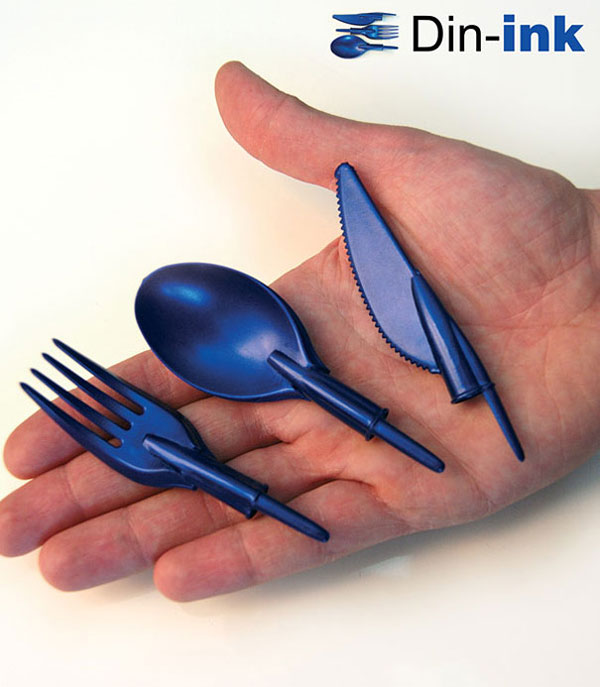 以無毒原料所製成的餐具原子筆蓋Din-ink,設計團隊ZO-loft將筆蓋設計成刀叉跟湯匙形狀,只要裝在你身上的原子筆上,馬上就能把筆桿子變成刀桿子,讓你輕鬆用餐,也許有人會擔心咬著原子筆蓋會不會有中毒的可能性呢?設計團隊說明這組Din-ink都是用100%可生物分解的材質製成,並不會讓你吃到口吐白沫的,請放心大口咬下去!