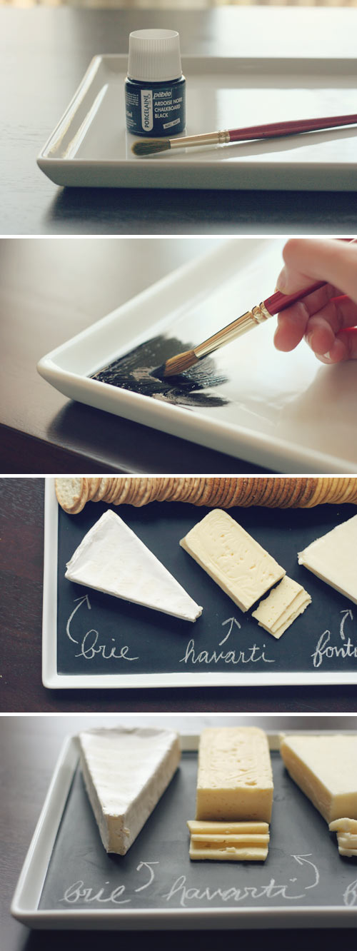 這位部落客另外也用黑板漆做了一個瓷盤,上面可以擺放相同品項不同名稱的起士,或是要分配給不同人的小蛋糕,黑板漆塗料本身比較像是陶瓷的釉料,但是令人擔憂的還是粉筆的灰會不會被吃進去阿…