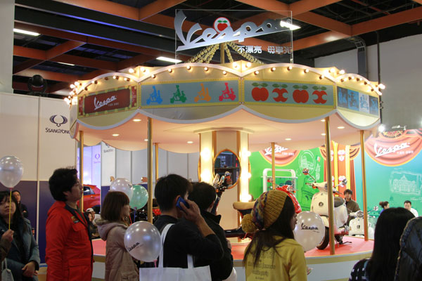今年Vespa在2012台北國際展場中花費百萬打造一座色彩繽紛的旋轉木馬,並特別商借來與世界上第一台原型速克達 Vespa98系出同源的 Vespa125 展出,以及宣佈紀念第一代原形車的 GTV300ie正式在台上市。
