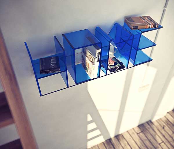 透明的壓克力書架,或者直接擺放於地,或者懸掛在牆,或者當成隔間,或者作為床頭前的小桌,每個字母可以單獨成立,也可以相互組合成文字,不同尺寸,不同顏色,全看你想怎麼搭怎麼配怎麼變。
