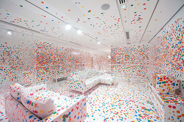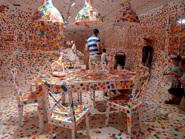 在Brisbane現代藝術畫廊,以點點出名全世界的草間彌生,在澳大利亞購買了許多純白色的傢具和擺飾,將整個房間佈置成一個巨大的,立體的白色畫布空間,這個巨大的作品叫做「The Obliteration Room」,是2011年草間彌生最新的創作。