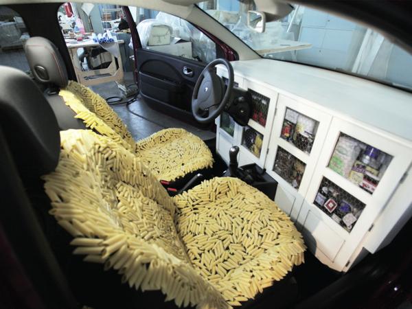 對義大利廚師Davide Scabin來說,開車就像下廚一樣,難怪一進到他的Scabin Pasta Twingo,一眼就看見那兩張義大利麵坐墊,坐上去,可得要有戰勝自己食慾的決心!