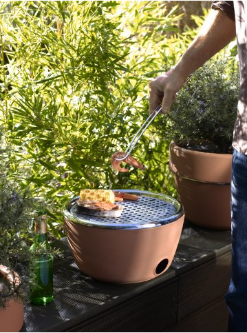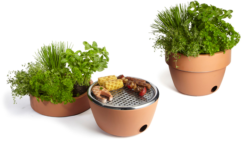 由BLACK + BLUM 公司所設計的HOT-POT BBQ,將盆栽與烤肉架做結合,平常時候看起來是一個紅陶做的盆栽,可以在上面種種花草。但是裡面可暗藏玄機隱藏了烤肉架,等到需要烤肉的時候,只要把上面的部份拿下來,並在裡面放入炭火,就可以變成烤肉架。