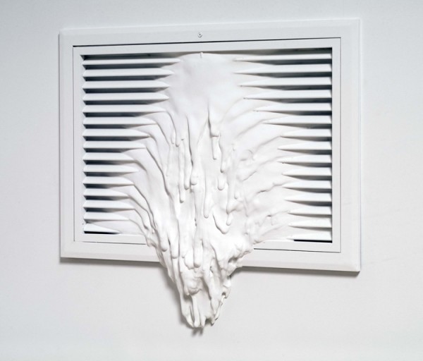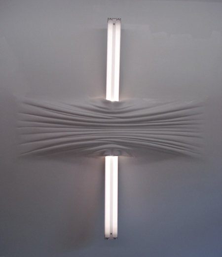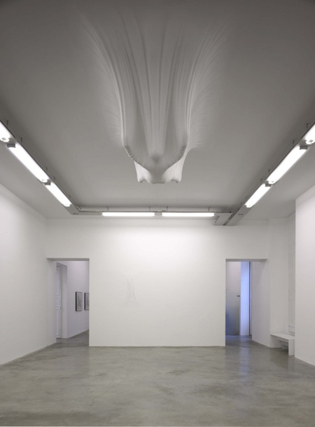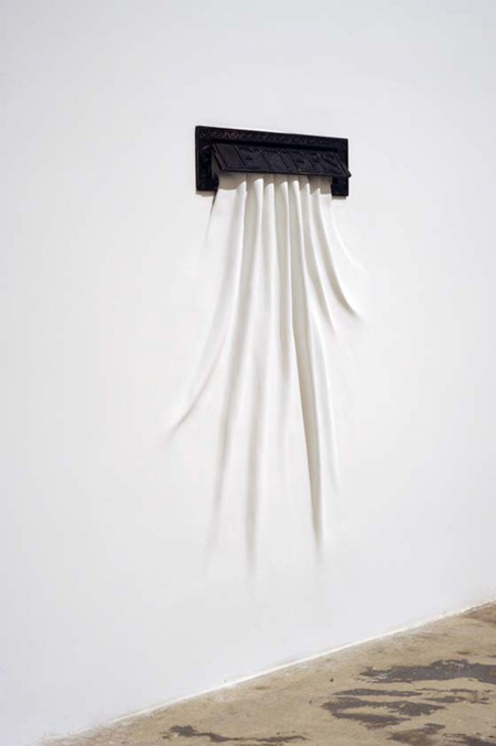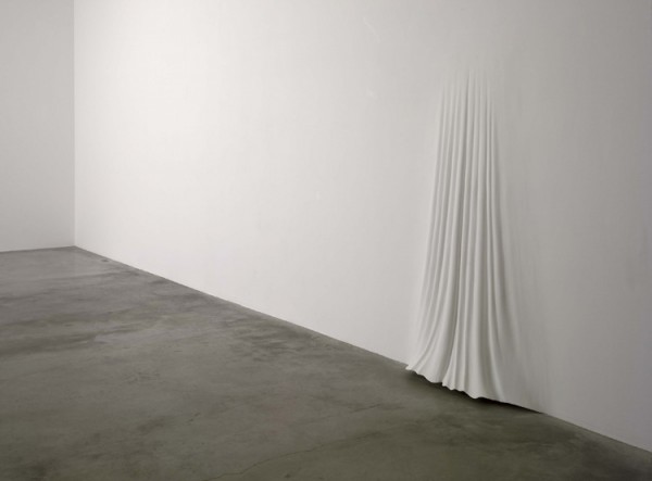 藝術家Daniel Arsham的朋友,大多都是建築師,所以他在建築師中的世界慢慢構築出自己對結構的愛,利用石膏,紗布,橡膠,油漆等等材料,對牆面做出各種皺摺,彎曲,挖空或是打結等等造型,讓純白色的牆面突然間有了情緒。