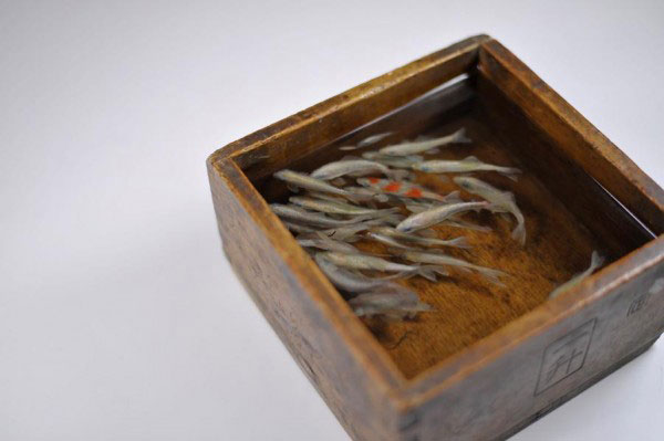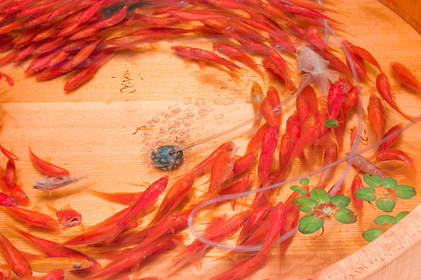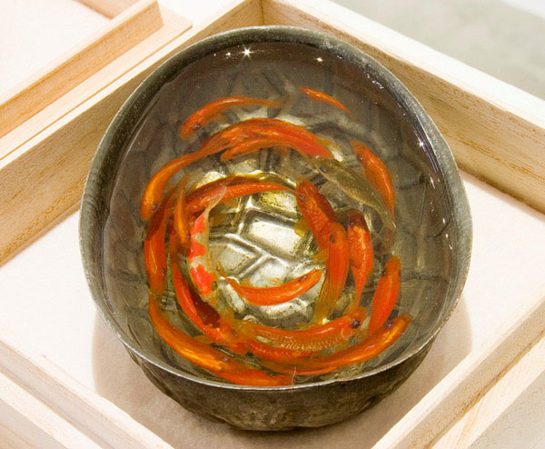 日本藝術家深崛隆介相當喜愛金魚悠遊水中的美麗姿態,於是他利用獨特的 3D 層疊技法,在水槽容器內畫上金魚,再一層層上透明樹脂畫上金魚其他細節,透過相當繁瑣的三明治式技法,層疊累積的金魚細節從上面看起來,就如同活生生的金魚般真實,相當不可思議。