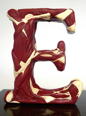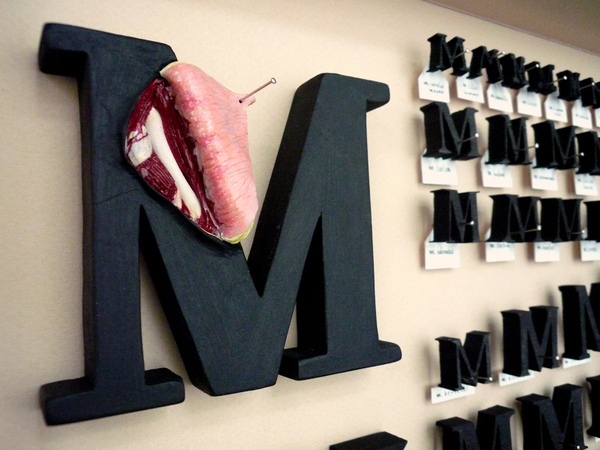 被解剖中的字母和已經沒有皮膚的字母,展現了肌肉和骨髓,用黏土木材等等材料混合製作,在視覺上原本無生命的字母就像是活過來了一樣。
