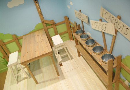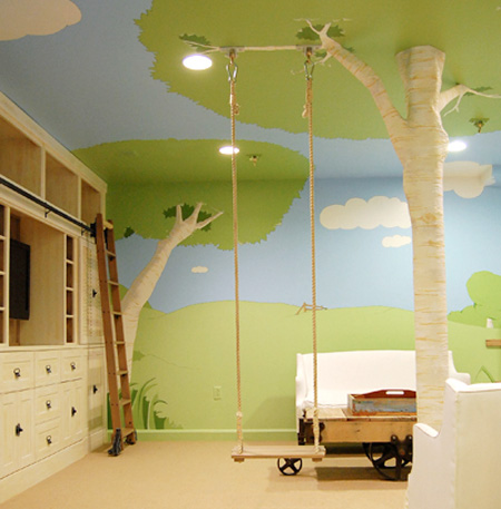 以自然為主題的房間,從牆上到天花板每一個地方連門都不放過,都是以樹屋的造型來呈現,就連房間裡也有幾顆裝飾的樹木以及鞦韆,讓整體的感覺一致。樹屋造型的房間,不僅提供了小朋友遊戲的空間,更具備良好的收納空間。