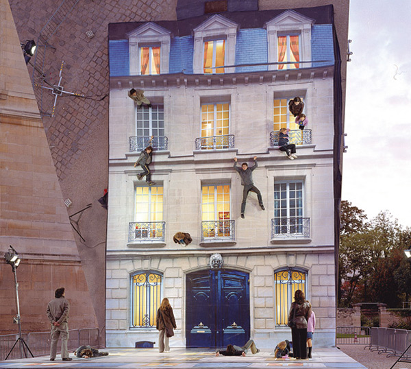 藝術家 Leandro Erlich 設計了一個簡單又非常有趣的建築物Bâtiment,Bâtiment 其實是一個鏡面裝置藝術透過鏡面反射的原理,將地面上的圖案,反射到看似是一棟房子但其實是一面鏡子上。民眾可以依照Leandro Erlich 地面上設計的圖案,窗戶、屋頂、窗台、牆壁,展現出童心未泯的想像力,就連隨意站在地面上,也像是無畏地心引力一樣,站立在牆面上一樣。