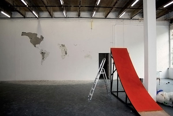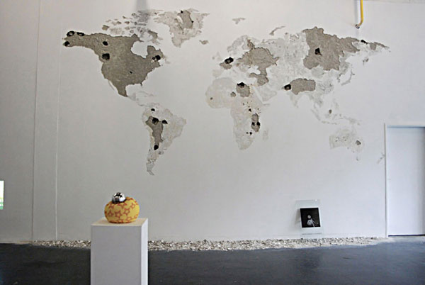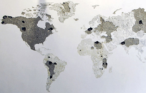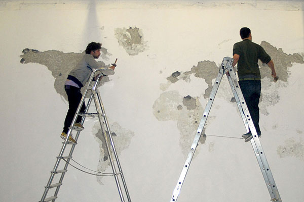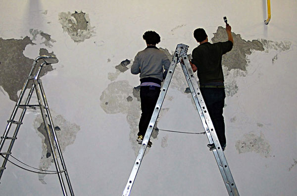 想到要裝潢新家,總是會讓人想破頭,空白的牆面上該放上什麼裝飾,才能符合自己的調調呢?很有想法的法國藝術家 Jean Denant,面對一堵空白牆面不打算保持它的光滑平整,而是用榔頭、鑿子等工具狠狠地在牆面上敲敲打打,利用牆面的自然凹陷,敲打出一整面的世界地圖。