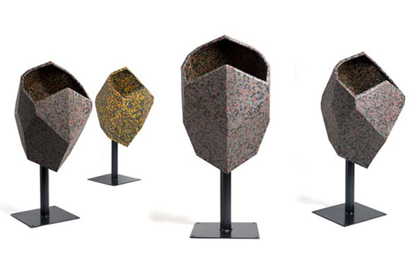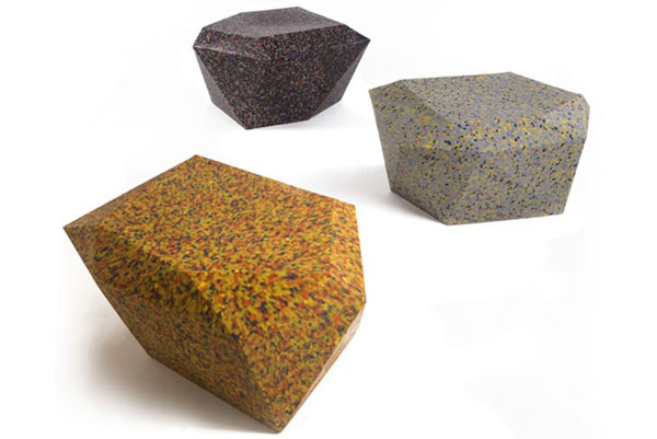環保的最高指導原則「回收再利用」,到了智利設計師Rodrigo Alonso的手中,似乎成為源源不絕的創作靈感,照片中有著鑽石般形狀、岩石般色澤的椅子,其實全都是塑膠製品回收再利用所製成,像是電子產品、玩具,甚至塑膠皮墊,回收後利用滾塑技術灌模、加熱、重新塑形後,就能成為一張張有稜有角的塑膠椅。