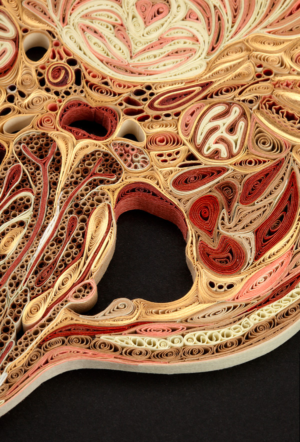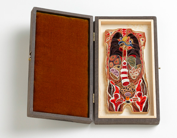 藝術家Lisa Nilsson使用日本一種叫做「mulberry」的紙,利用各種大小的卷度,紙張本身的顏色,凹折了幾個星期組裝之後,就成為了一幅一幅橫向或縱向的解剖圖,麗莎特別為這些作品製作專屬的木盒子,讓這些脆弱的紙張成為一種藝術品。