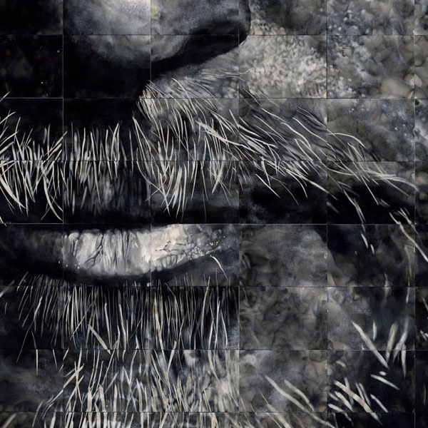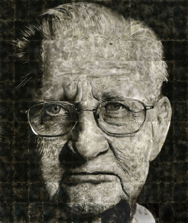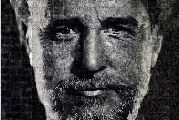可以看得出來作品由統一大小的小方塊組成,而在火焰留下這些印記之後,他以刷子,刮刀甚至是指甲等等工具,在煙灰上面做了許多層次筆觸,進而組合成一幅巨大的肖像畫作,但是僅限於黑灰白色,說不定以後能夠研發出彩色的作品阿!