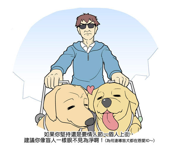 咳咳.....一年一度的西洋情人節,除了是愛侶閃光爆發日、商人海噱賺錢日之外,其實也是單身怨念指數最高的一天,一個人走在街上見到了忘我的閃光情侶們,往往都會觸景傷情或傷眼導致空虛心靈二度受創,所以有些單身過情人節注意事項,大mAn秀在這裡也要告訴你,以免慘案再度發生。(推眼鏡)