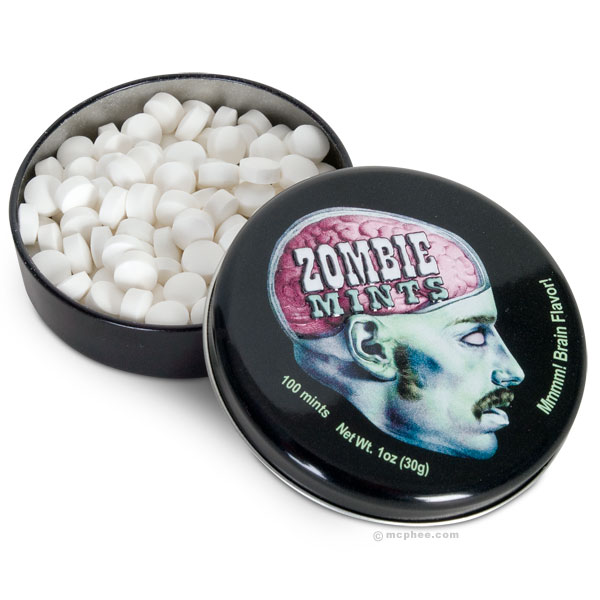 當你遭受感染時,此時身邊又沒有活人可以吃他的腦,或是需要跟同是殭屍的女殭屍求愛口氣又不是很清新時,就需要緊急的來一顆腦味薄荷糖!腦薄荷糖這邊可以購買。