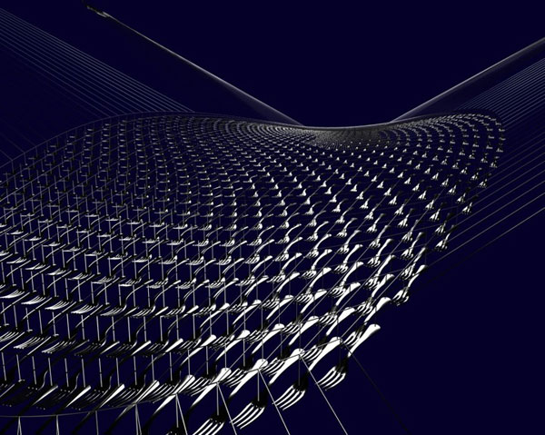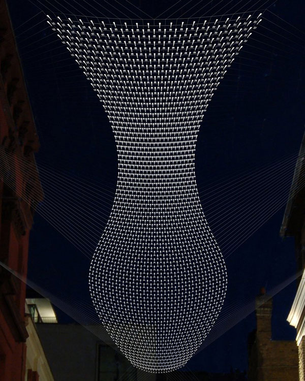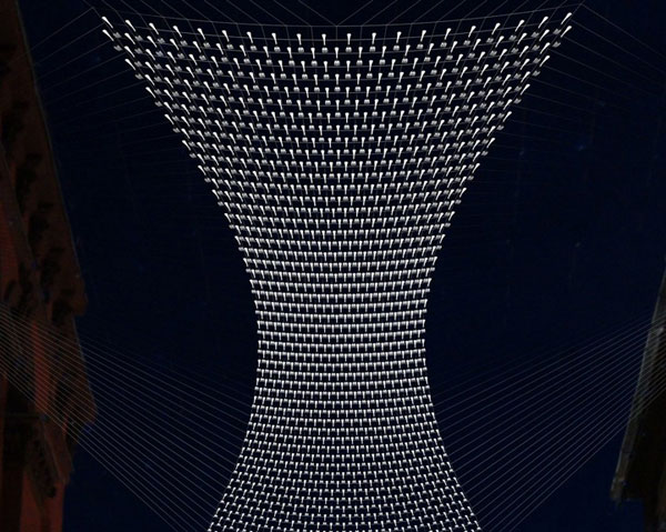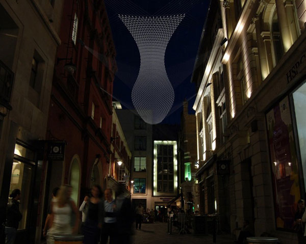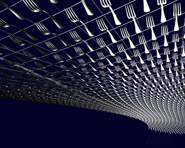 很顯然不管在什麼場合下,一般人都不會預期見到大量的餐具飛在頭頂上,不過如果你人位在中央倫敦的Heddon Street上用餐,你頭上除了大量的餐具就沒有別的了!這個名為Cutlery Fish的裝置藝術是由 設計師Ian McChesney利用線編織固定而成的。動用大量叉子的原因並非哪家餐廳嫌刀子多,而是為了替這條街上的餐廳樹立一個標誌性的裝飾,讓人們方便認出。該地的地主委託了McChesney和他的廣告商Plan Projects聯手打造這樣壯觀的裝置藝術。
