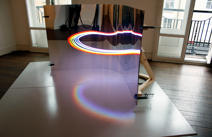 好啦~關子再賣下去可能會被你飛踢,趕緊來公布謎底,這朵雲並不是合成照,也不是外星人駕臨,其實是澳洲藝術家Steven Morgana充滿創意的裝置藝術作品「Beauty Is In the Eye of the Collective」,透過這個作品挑戰人們認知中真實的可能性,利用錯覺原理將半圓形的霓虹燈管安置在弧形鏡面後,經過反射之後就成了這道夢幻美感的 七彩霓虹雲,果然如同作品名稱一樣,真的是我們眼中的美麗啊!