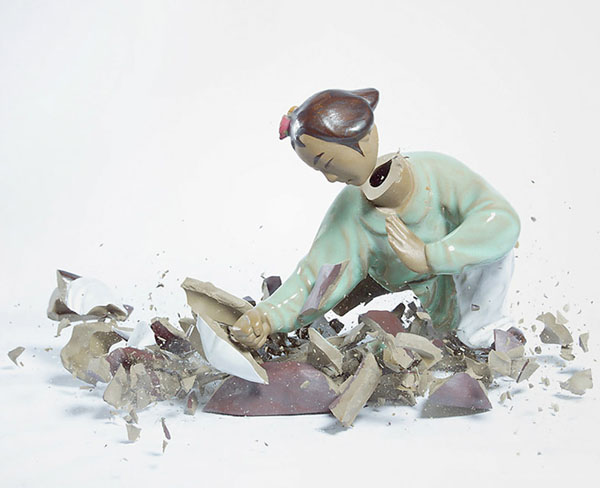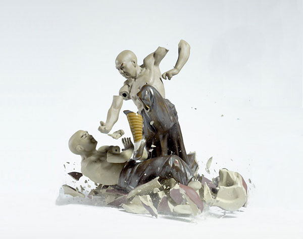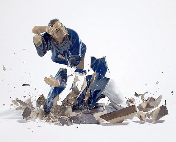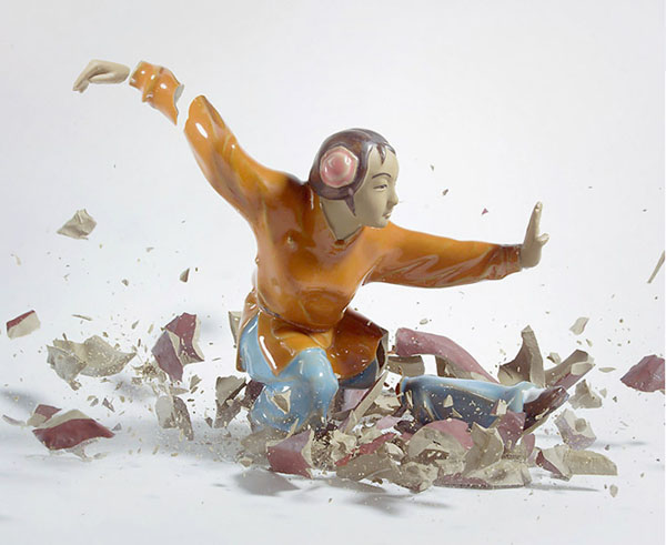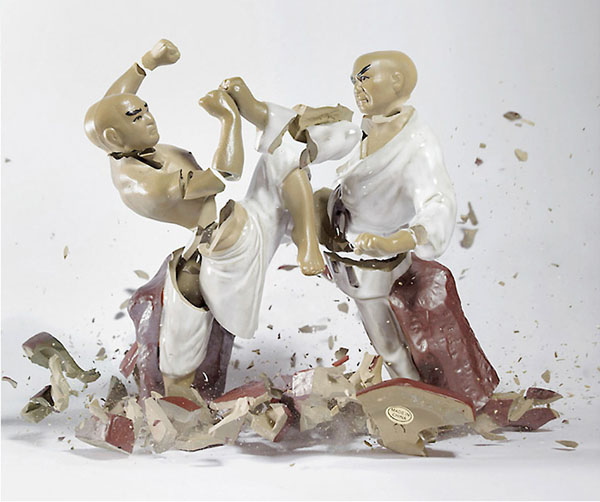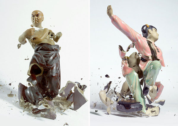 德國攝影師Martin Klimas則拍攝了一系列瓷器從高空掉下破碎的畫面,使用了高速攝影技巧,捕捉了武術瓷器互相碰撞碎裂的凍結畫面,碎裂的感覺就像是兩個不好好習武的人,互相比式之下,導致兩敗俱傷的結果,而瓷器原本就生動猙獰的表情,更讓這些碎掉的雕塑更添加生動的元素。