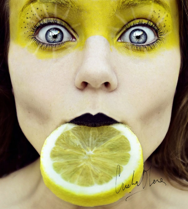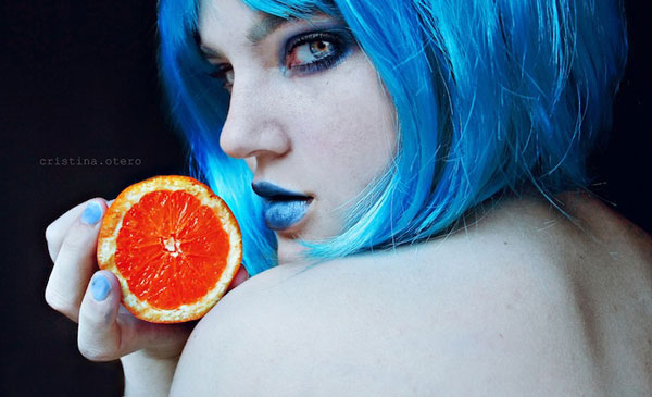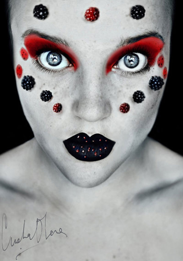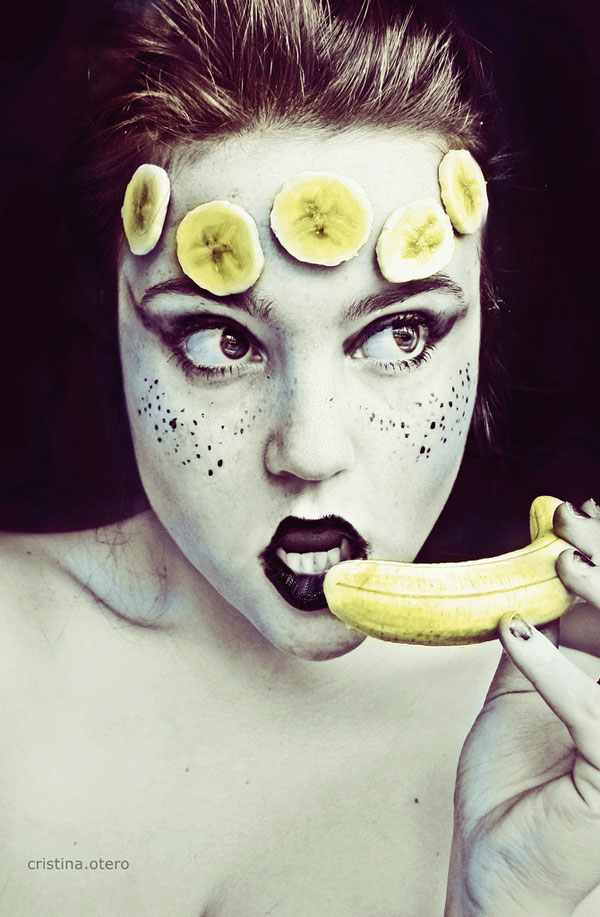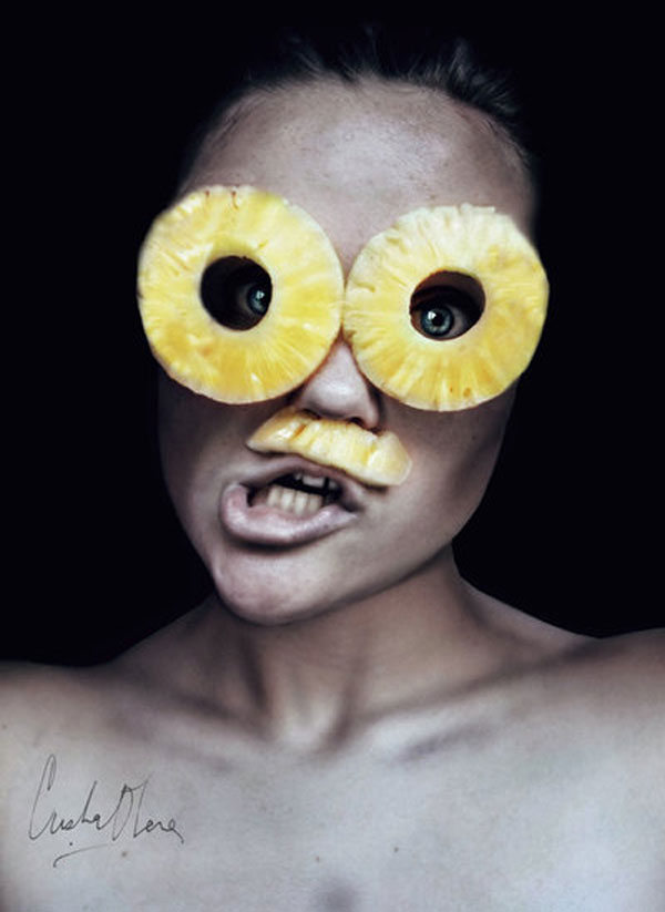 Cristina相當喜愛拍攝人物肖像,她說:「人臉就像一部充滿情緒與想法的字典,你從一個人的臉部表情就可以看穿她,很容易就可以解碼。」於是她把自己的臉當成了畫布,各式各樣的鮮豔水果就如同顏料,再她的臉上完成一幅幅人物水果畫,嬌豔欲滴的鮮豔果實,真是讓人忍不住想咬一口啊~(羞)