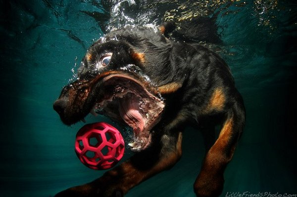 原來攝影師利用狗狗們喜歡追球的天性,引導小狗們跳到水池裡面追逐網球,然後再利用防水的相機拍攝他們在躍進水池那一剎那的表情。水底特殊的光影變化,加上狗狗們天真無邪不做作的神情,讓人不禁聯想到牠們果然是人類最忠實的朋友啊~