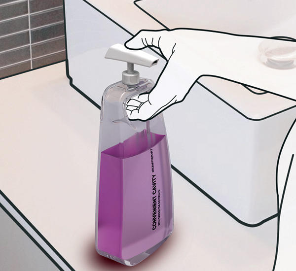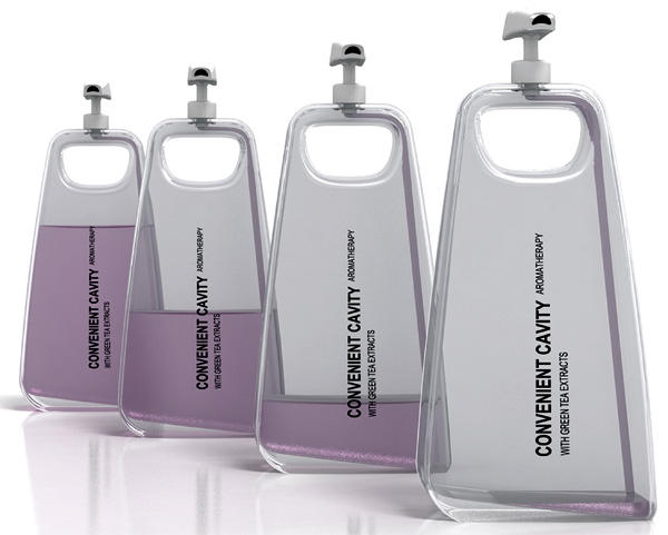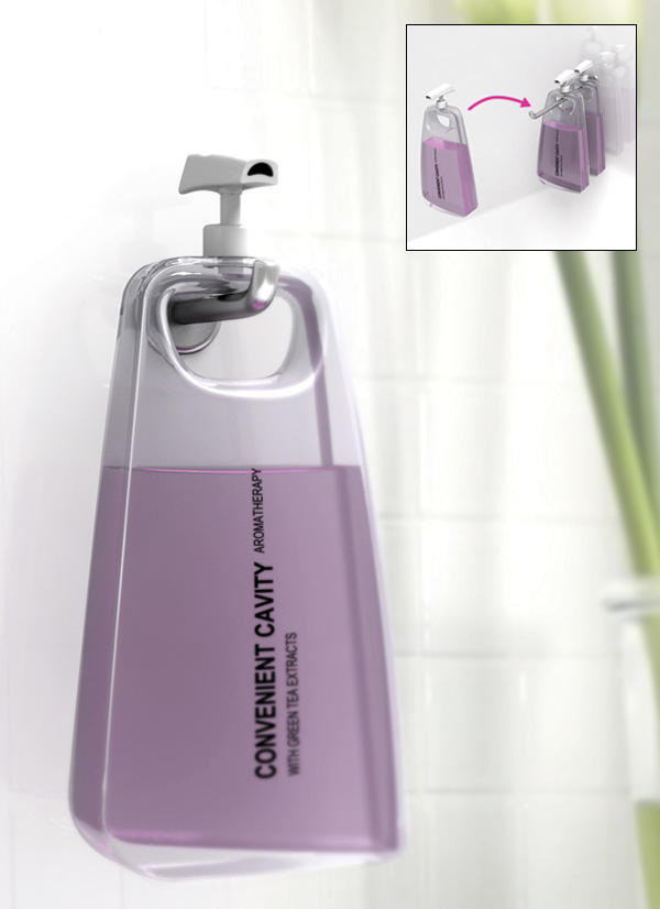 這一款外型簡潔的沐浴乳瓶身設計叫做「Convenient Cavity」,它最大的特色就在於它能夠讓你在洗澡或洗頭髮的時候輕鬆地一手就可以擠出需要的沐浴乳。瓶身上面的洞可以讓我們把不用的洗髮精或沐浴乳以及潤髮乳等等都掛置在牆壁上,簡單又方便,不用在把瓶瓶罐罐丟在浴室的地板上。這一款設計曾經獲得2011年的 red dot design concept (紅點設計)。