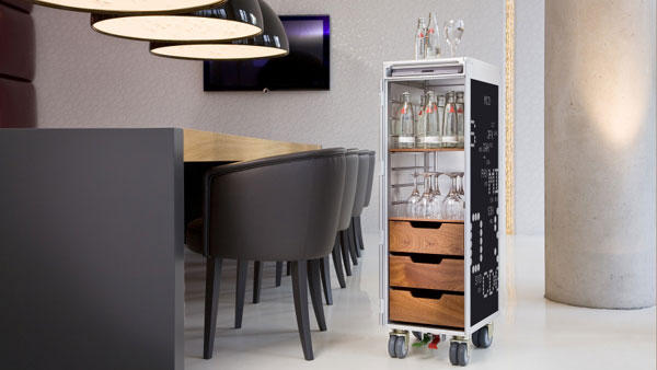 收納機能對航空餐車是基本要求,Skypak 在餐車內仍保留了許多層架,足以應付各種不同餐具、飲料、酒瓶的高度,你可以推到廚房煮咖啡,也可以推到餐廳當酒櫃,更可以推到浴室、臥室甚至是游泳池畔喝一杯。