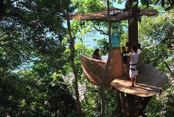 在泰國Soneva Kiri度假村裡的Khun Benz餐廳,就提供全球獨一無二的樹上用餐享受。讓賓客在一個新奇而私密的環境中擁抱大自然,享受畢生難忘的浪漫二人世界。Soneva Kiri 度假村費時逾五年時間興建,就是為了驚艷全球,讓經常流連於高級酒/飯店的顧客也能一見傾心。