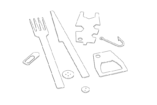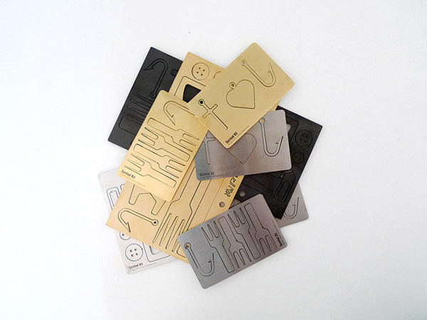 由設計師Robert Rüf和Steffen Kehrle設計的迷你生存包卡片,首先先來看看時尚的金屬材質外表,一共有三種顏色,分別是嘻哈風金、銀色衝浪手的銀、低調黑,從大小來看共有兩種尺寸,一種名片大小適合放在皮夾中隨時備用,另一種明信片大小也許可以寄給朋友當做佳節問候,以及放在六孔萬用活頁夾中。裡面的配備在如此迷你的尺寸中算是完善,有各種圖形的項鍊、迴紋針、鈕扣、開罐器、開瓶器以及刀叉組,甚至還有魚鉤,姑且不論美觀度好使度,在危急情況時,有叉子可用完全勝過用原子筆當做筷子阿!