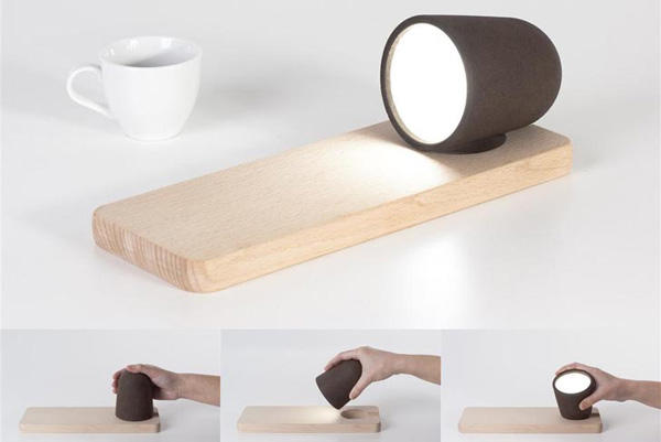 Decafè Lamp 有許多造型,而這款小桌燈則使用了特別的開關法,杯口蓋向木頭底座時,燈會自動熄滅,拿起杯子時燈就會亮,也可以自由調整照明角度,非常貼心的設計。