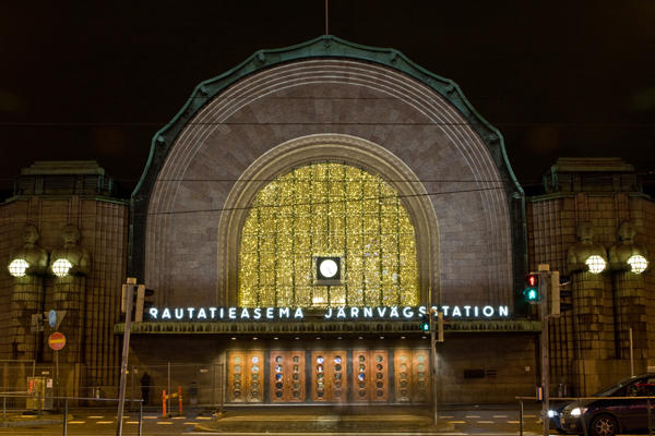 晚上的中央車站(Central Railway Station)顯得燈火通明,除了大大的拱形屋頂外,兩旁的雕像,環抱著圓形的照明燈,一整夜為旅客點亮回家的路,據說現在不少芬蘭的廣告,也喜歡找這幾尊雕像來當主角喔!