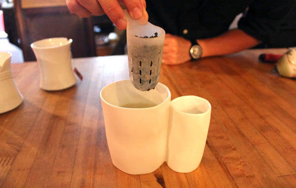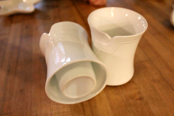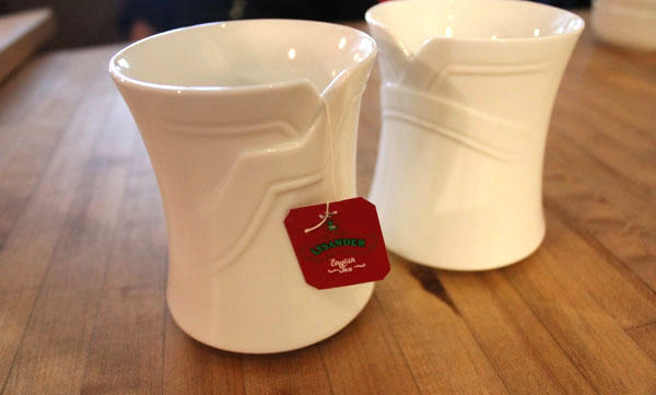 「Kiri(霧)」,這是討喜小姐最喜歡的另一個作品,和其他杯子相較之下相當薄的杯身,讓使用上拿取很輕鬆,而黏著大杯子旁邊的中空手把,是放置茶葉濾網的地方,最有趣的一點是杯身沒有塗上光滑的釉料,所以在茶水滴落之後,就會成為使用者獨有的痕跡,在長年累月使用之後,你的杯子就會和原先購買的不一樣,而稍微粗粗的觸感,也讓手握著杯子和溫熱茶水微微透出的溫度有了呼應。