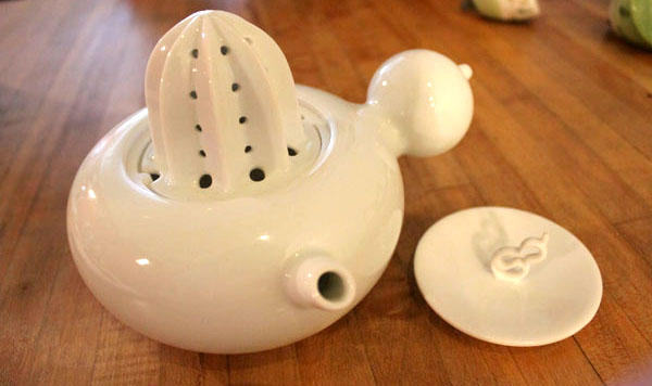 「享壺」,造型超級可愛的茶壺,握把很像之前大人物介紹的「門把馬克杯」,但其實它是個葫蘆的造型,中間的尖椎型濾網設計,在泡茶時是茶葉的濾網,但反過來就成了果汁的榨汁器,握把的圓形造型握起來非常舒服,而名字也取得非常好,很適合喜歡打麻將的朋友:「想胡」阿!