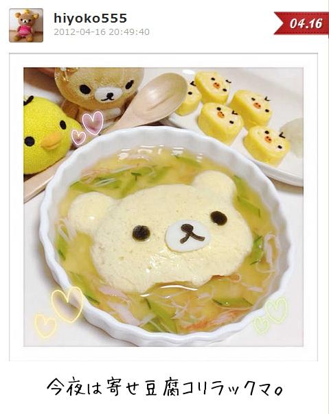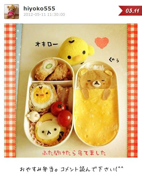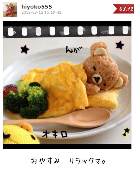 「My365」(<-點選可下載)是一款在Japan App Store很受歡迎的應用程式,整體風格非常可愛,深受許多女性喜愛。由於它涵蓋了社群功能,所以可以用此款App與朋友在裡頭互動,像是:照片上傳、瀏覽相冊、好友收聽、分享至社交網站等。這個app上的其中一位使用網友:hiyoko555,自今年2月開始,就將自己以懶懶熊為主題做出的美味料理上傳。由於他做的料理實在是太可愛了!立馬引發大量網友熱列討論及關注。