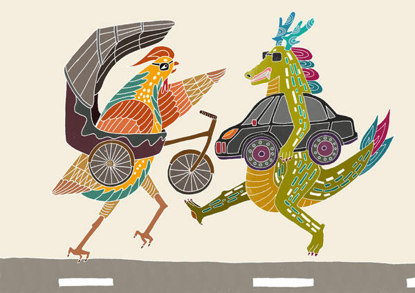 「行」傳統的三輪車與現代汽車(朱雀與青龍)