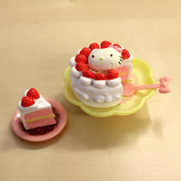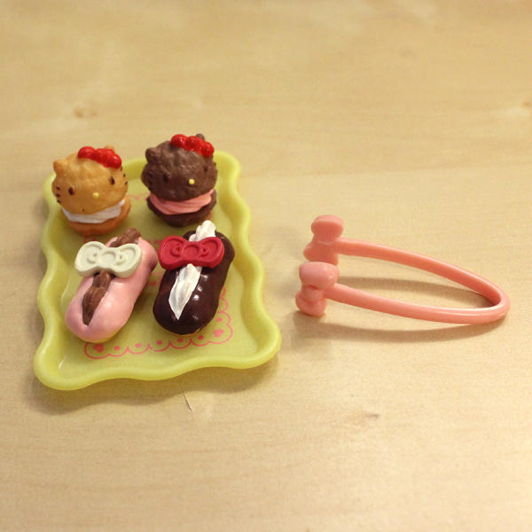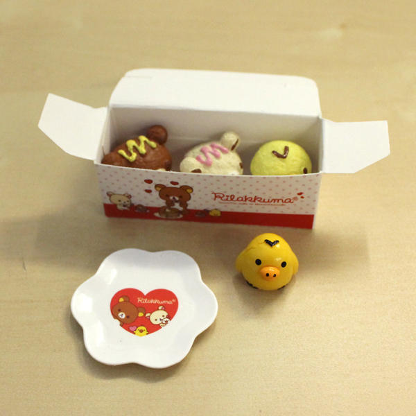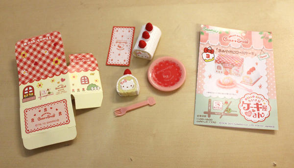 盒玩內容物:「拉拉熊的草莓點心時間共八款」、「拉拉熊的飯煮好了,開飯囉!共八款」、「Hello Kitty凱蒂貓的甜蜜蛋糕屋共八款」以及「拉拉熊咖啡廳桌椅組(椅子兩張桌子一張)」和「拉拉熊展示櫃一個」(拉拉熊咖啡廳桌椅組」和「拉拉熊展示櫃」不包含圖中盒玩)