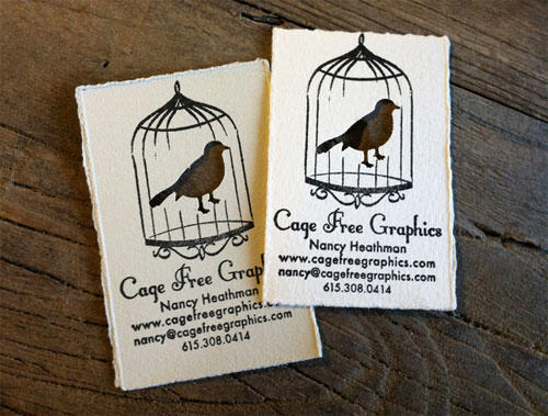 ▲「Nancy Heathman」的手作名片利用雕空、版畫、手撕的方式,將圖案和資訊印製在版畫紙上,厚重的版畫紙會在很多人的名片冊中佔有一席之地阿!雕空的鳥圖案,讓名片擺在哪裡就有哪裡的質感。