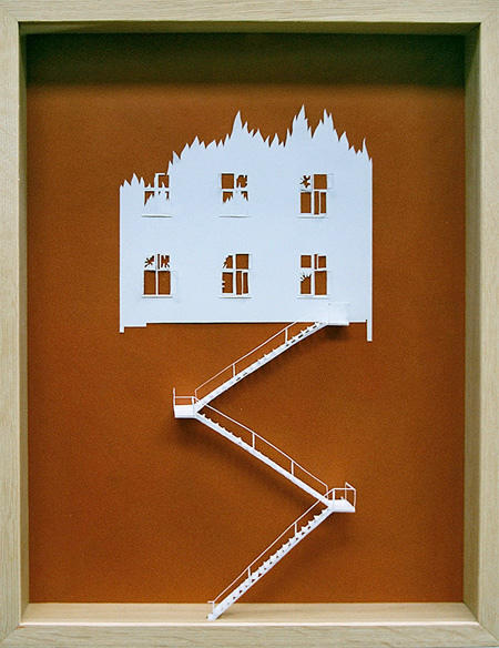 這幅名為Half Way Through逃離一半的作品,從作品名稱就可以窺知大師的創作意圖,Peter Callesen表示,該作品表達出人們常常會想要逃離一切,雖然作品中的人物已經成功脫離了一半,但依然無法脫離本源(那張紙),也根本不可能逃離作為紙的命運。