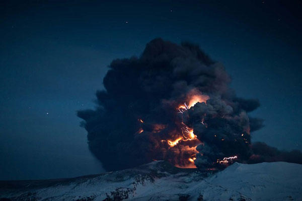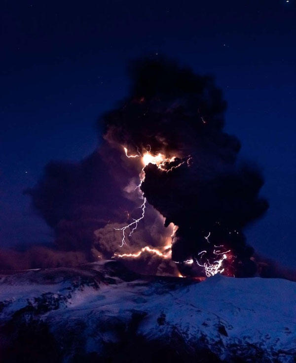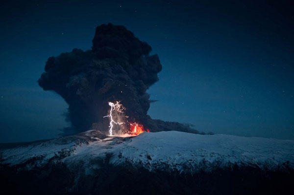 還記得2010年冰島的火山噴發,造成歐洲氣候與航班大混亂的事情嗎?透過雷克雅維克的動態設計師 Davíð Jón Ögmundsson 的精準捕捉,讓我們看見了這驚人的絕美景色。伴隨著火山噴發伴隨著火山爆發,所產生的巨大壯觀自然火花,晴天霹靂般的閃電雷鳴,在夜空中成了最不可承受的美麗景象。