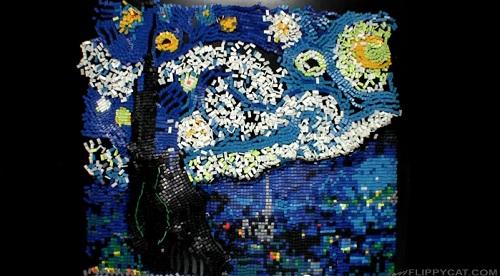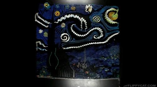 骨牌跟梵谷,聽起來應該是八竿子打不著的兩個詞,但是骨牌藝術家FlippyCat卻想出利用骨牌自然跌落的姿態,仿效梵谷畫作漩渦式的視覺筆觸,花了11個小時時間、利用超過7000片骨牌排出觸動人心的「Starry Night」,作為對於梵谷的創意致敬。