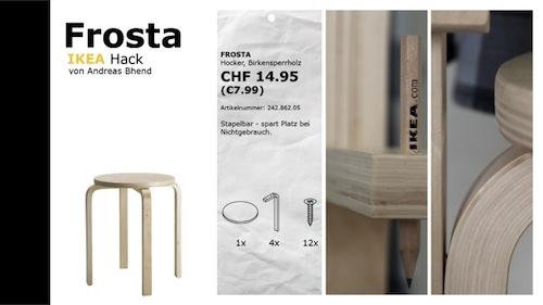 在這個過程中,他特地挑選結構單純的椅凳產品 Frosta,試著故意把這隻椅凳組裝成咖啡桌、書櫃和衣帽架這種跳 tone 跳很大的傢俱,甚至還把這些組裝方法,再另外印製一本說明書,不得不佩服他的認真。但經過他神奇的變化,讓人發現,原來,椅凳不只是椅凳,變型後的產品比原來正常的組法還要更吸引人,用椅凳的零件組出一個吊衣架實在太讚了!