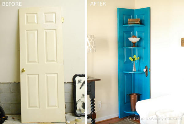 有在注意風水的人應該知道「進門斜 45 度角的角落就是財位」,姑且不論是不是真有其事,但角落確實是家中最容易被忽略,最容易囤積雜物且又不好佈置收納的地方。市面上看過很多專為這兒所設計的三角角落櫃,多是塑鋼製品或合成木板,看起來冷冰冰又毫無生氣;時間久了,又開始淪為堆積物品的收納櫃。還是自己動手來做一個吧,來自美國的 Linda 在她的 Craftaholics Anonymous 部落格中發表了一篇,把不要的舊門板,從平面改造成立體的角落櫃,美化了家中的轉角處。