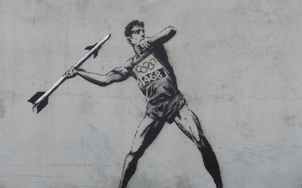 這兩張照片就是他針對倫敦奧運的最新創作,握著飛彈的標槍運動員和飛越圍籬的撐竿跳選手。依然有Banksy的一貫風格,他刻意選擇和賽會有關的主題,看似宣傳奧運競賽又帶著曖昧的反諷意圖讓人各目解讀。難就難在這裡,Banksy遛去以塗鴉的方式為倫敦聚集過許多全球的注意力,這正好也是奧運會所需要的。