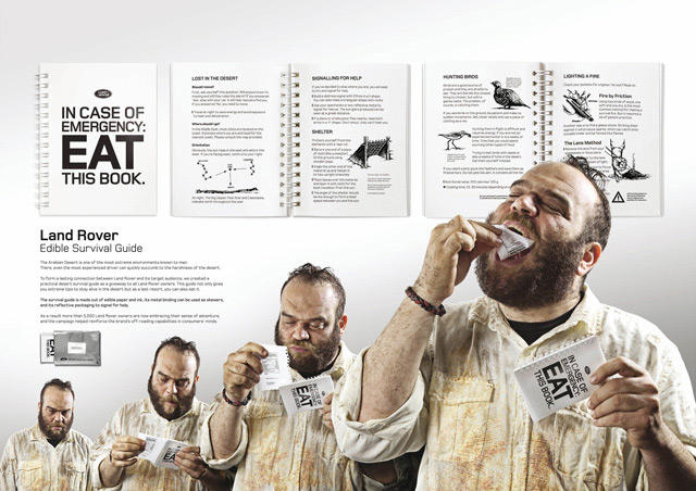人在肚子餓的時候常常是飢不擇食,什麼都吃,而且任何食物在這種時刻還會顯得更加美味,如果真的遇到生死關頭,只要能吞下肚的東西更是會讓人感動到落淚。雖然我們平常生活衣食無慮,不過看到Discovery荒野求生密技節目主持人在叢林裡闖盪,還是會想學學如何在惡劣的環境下吃得飽又吃得巧(誤)。除了電視節目以外,Land Rover也為他們的車主印製了很特別的野外求生手冊。